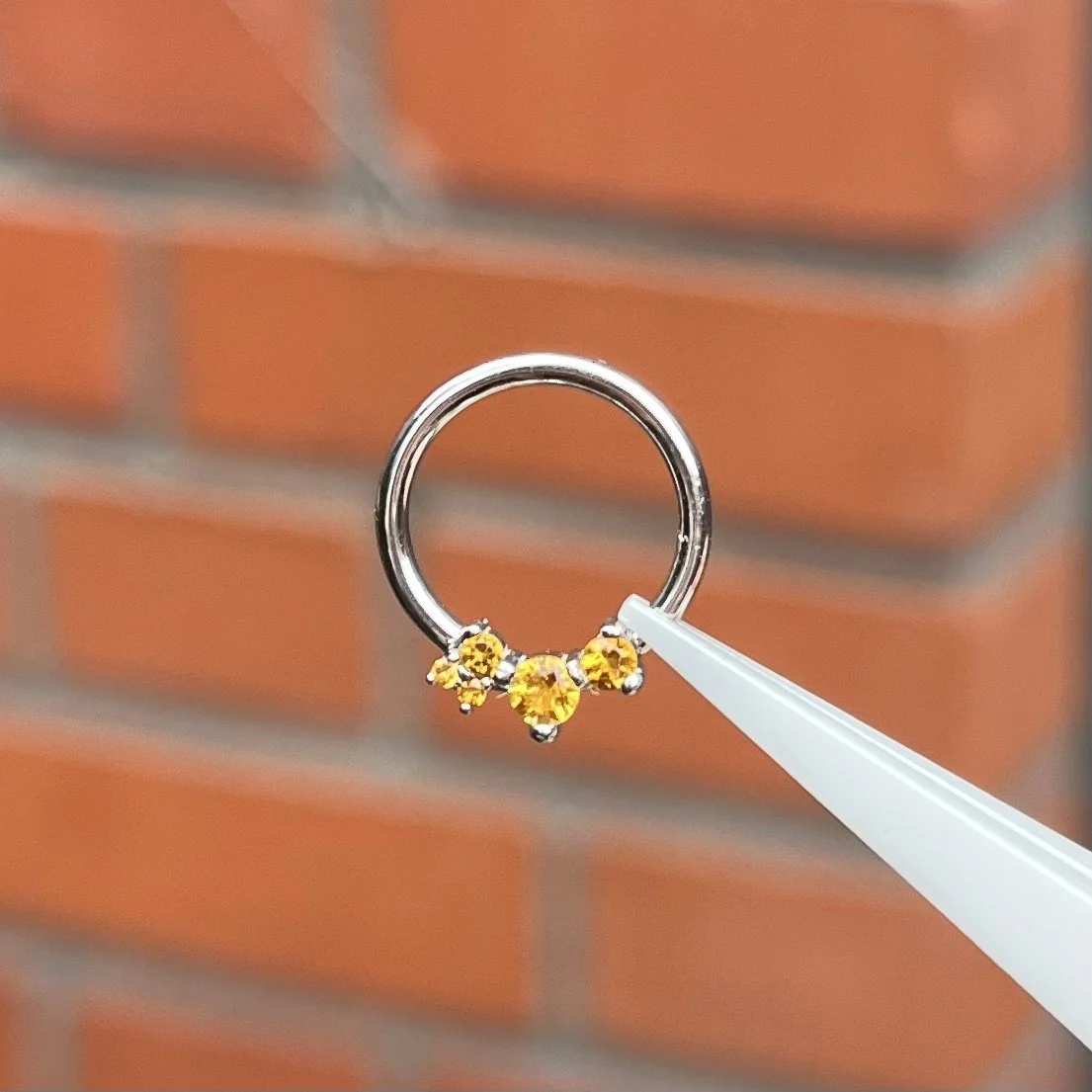 A stunning seam ring, with asymeterical stones, measuring 16g 3-8. Perfect for fresh + healed daith, helix and lobe. Solid white gold with genuine citrine.